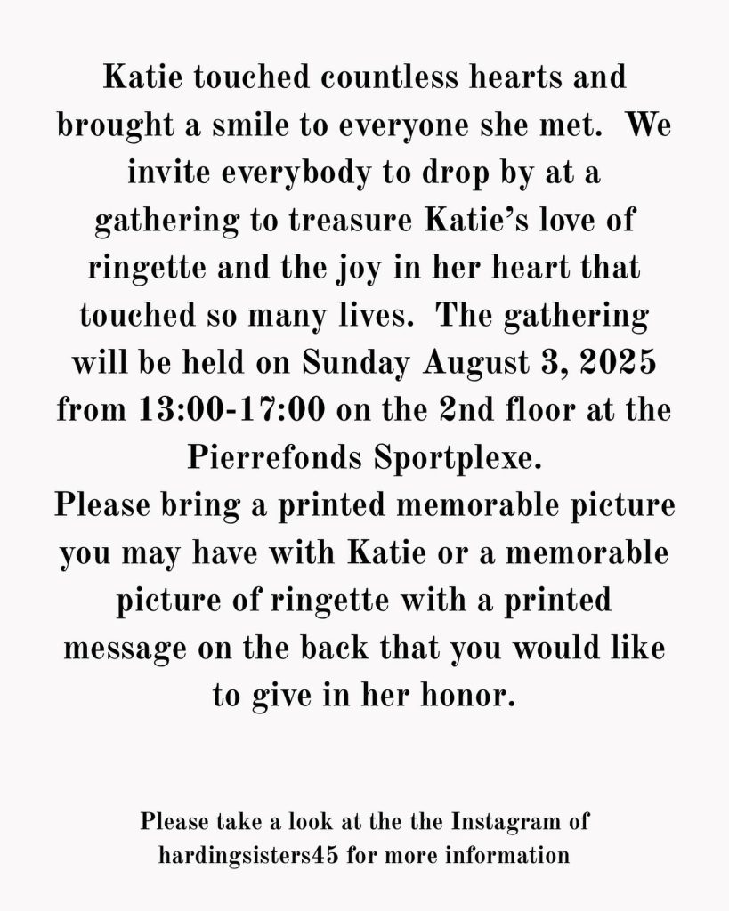 We invite you to share your condolences and memories of Katie on the Instagram page she shared with Cassie: hardingsisters45.