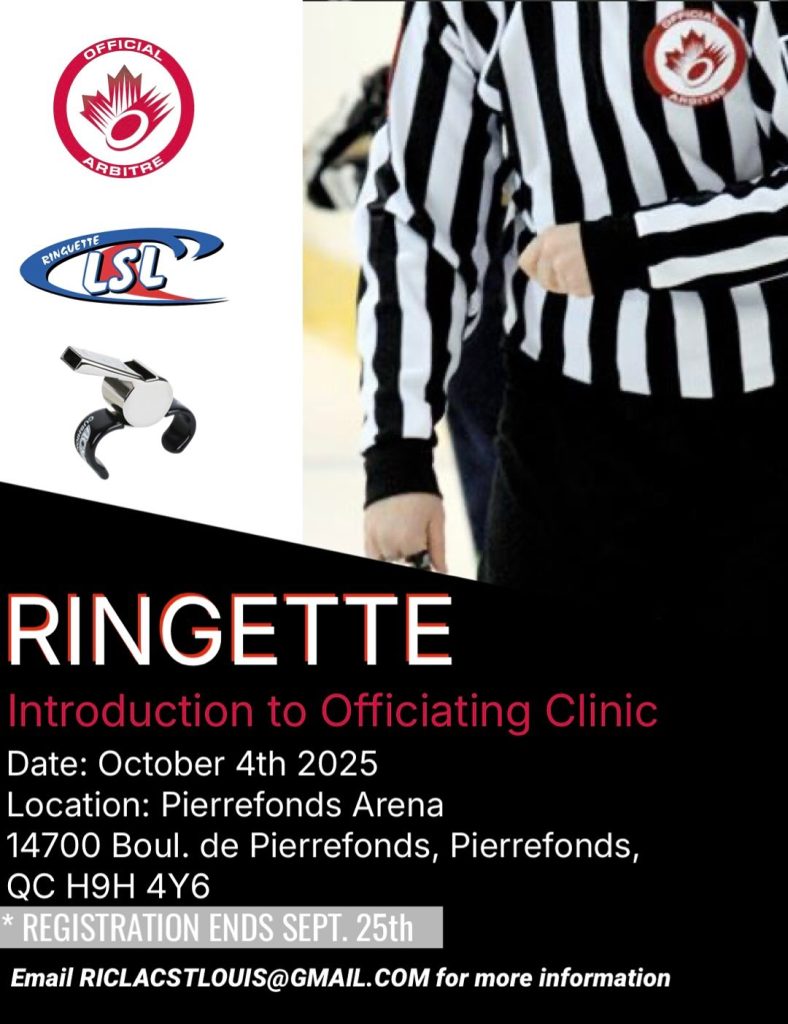 Lac St-Louis will be hosting the Level 1 Officiating course October 4 at the Pierrefonds arena.